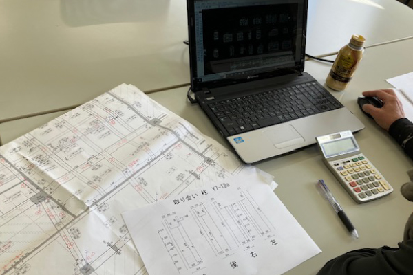 施工図をもとに柱・梁・壁・床の寸法、形状を拾い出し、型枠の加工図を作成し、必要な材料を計算し発注。