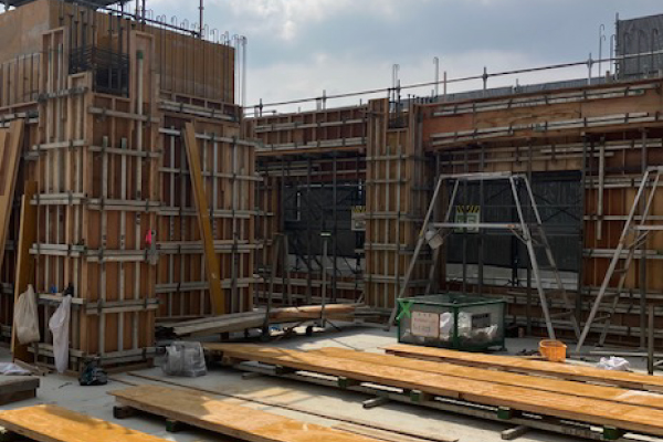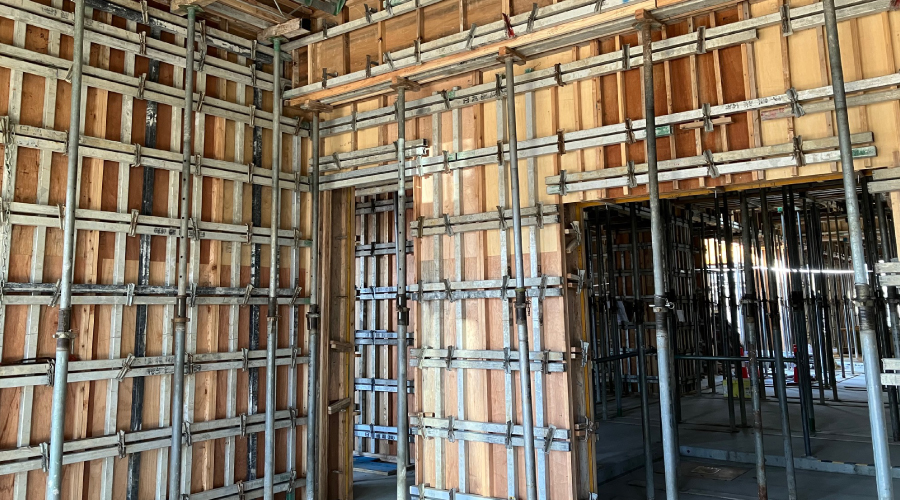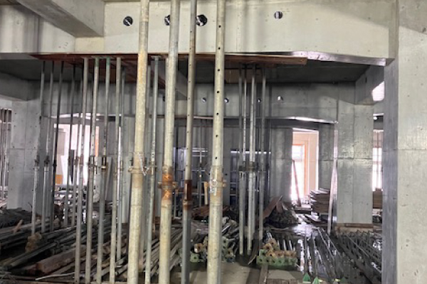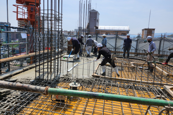 型枠の中に生コンクリートを流し込む。コンクリートの打設は別職種が行うが、打設前と打設中の点検は型枠大工の仕事。